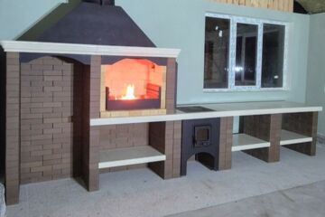 Вы можете разместить модульные печи барбекю на открытом воздухе, так как фасад покрыт декоративной штукатуркой, которая защитит барбекю от внешнего воздействия окружающей среды. Помимо этого можно осуществить установку элементов для приготовления пищи в беседке или на террасе с навесом с помощью переходника на сэндвич трубу. Такой переходник позволит безопасно вывести дымоход сквозь кровлю. За счет двойной трубы с утеплением(сэндвич) вы можете осуществить отвод дымовых газов  и увеличить тягу воздуха, что поспособствует большей теплоотдаче от углей или дров. Комплекс из бетона может состоять из мангала, печи под казан, тандыра, столика с мойкой и углового столика.